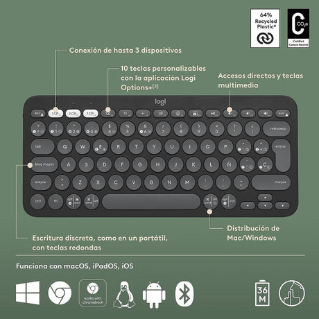 Teclado Bluetooth Multidispositivo Logitech Pebble Keys 2 K380s - Grafito